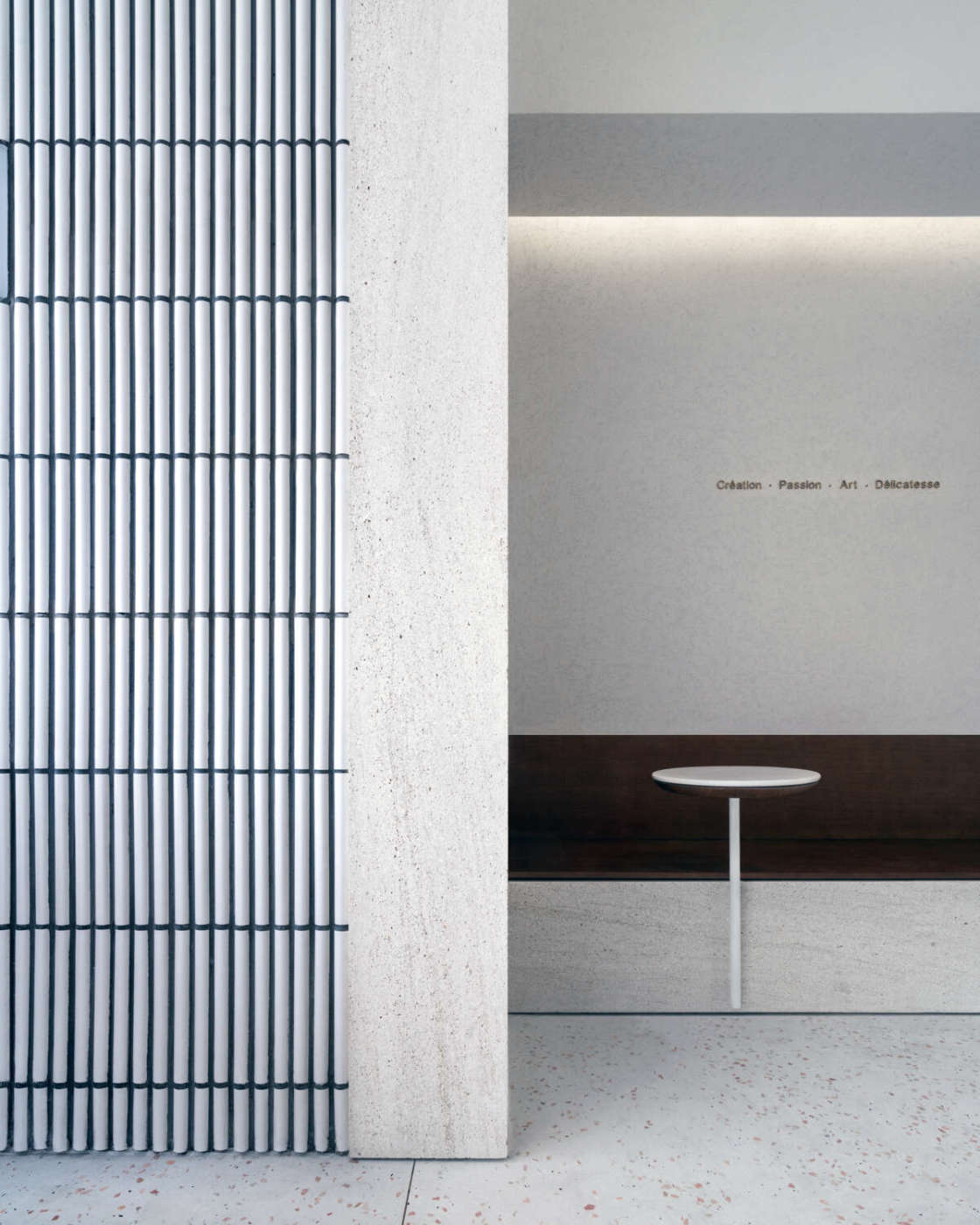 La pasticceria Angelot è infatti realizzata in uno spazio dai vincoli a prima vista insormontabili, tali da mettere in discussione più di una volta la scelta della location da parte dei proprietari. Primo tra tutti un pozzetto di sfiato dell’aria che occupava un terzo della facciata e che non poteva essere spostato, poi la struttura su cui si doveva intervenire che si presentava già parzialmente oltre il filo facciata e infine una pianta lunga e stretta che si affacciava verso uno spoglio e triste cortile. Condizioni, in pratica, che avrebbero impedito sia un ingresso facilmente accessibile, sia la presenza di vetrine espositive. E si sa che in una pasticceria la vista del dolci è, per i passanti, una grande attrazione. Lungi dal farsi scoraggiare, i Say Architects che si sono occupati del progetto hanno creato una serie di soluzioni alternative: «Invece di nascondere semplicemente tutti questi svantaggi, abbiamo cercato di usarli collegandoli ad un concetto semplice: un senso del rituale svelato gradualmente». Come prima cosa hanno mantenuto la struttura originaria creando però un ingresso a “imbuto” che cela dietro una griglia (che ben si armonizza con il pattern geometrico delle superfici) il famoso pozzetto, dopodiché hanno sostituito le classiche vetrine espositive con due piccole teche vetrate dove i dolci sono esibiti come gioielli pregiati. La mancanza di un’ampia esposizione su strada è diventata un punto di forza: l’Angelot si presenta come un luogo d’eccellenza, uno spazio da scoprire che si svela poco a poco. Così, chi vuole assaggiare torte e pasticcini si deve addentrare nel locale varcando un percorso sinuoso, accompagnato da pareti curve e da un’atmosfera eterea. Oltrepassato questo ingresso, i 150 mq della pasticceria non smentiscono le aspettative: il primo ambiente che si incontra è la sala esposizione e vendita, con un lungo bancone in pietra chiara rivestito parzialmente in legno. Ampio e monolitico, questo elemento è frazionato in tre blocchi che, in ordine, fanno da bancone bar, teca d’esposizione dei dolci, e banco distribuzione. Una soluzione unica per tre diverse esigenze. Alle spalle del bancone, il laboratorio. Tutte le pareti, così come il controsoffitto, sono stati trattati con un rivestimento in cemento rinforzato di fibre di vetro, una finitura che scalda la tonalità del bianco e la rende più morbida, più soft. Tre gradini differenziano la zona degustazione, ampia e dalla luminosità rarefatta. Questo era un altro dei problemi che aveva messo in crisi i titolari: ampie vetrate affacciate su una vista da nascondere. La soluzione è stata la più semplice: tende semitrasparenti che schermano la vista esterna ma lasciano filtrare la luce solare. Infine, quattro piccoli alberi di limone portano l’esterno all’interno, formando uno spazio intimo e privato.