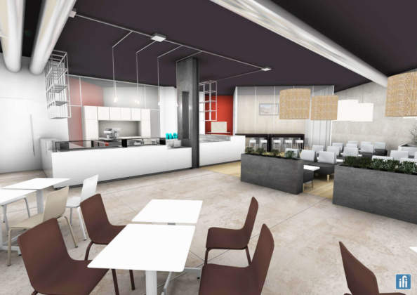 Nella nuova pasticceria Carrara che vediamo nei rendering in foto, l’offerta delle differenti tipologie di prodotto è articolata attorno alle diverse modalità di degustazione: che si tratti di una consumazione rapida, al banco o d'asporto, oppure di una più rilassata in sala, comodamente seduti. A spiegarci passo passo le scelte effettuate nel progettare il rinnovo del locale di Moorpark è l’architetto Luigi Iacopini, a capo del shopfitting consulting department di ifi. «Le lavorazioni più interessanti e artigianali dei laboratori di pasticceria e gelato sono portate all’attenzione del pubblico attraverso le vetrate trasparenti. Il bancone squadrato di linea minimale, pensato a forma di “U” e ruotato a 45° secondo l’orientamento inclinato della parete d'ingresso, permette un’ottimale distribuzione dei servizi, individuando in maniera definita le aree di caffetteria, pasticceria, gelateria, cocktail bar e zona cassa. Due isole di lavoro attrezzate e un mobile contenitore divisorio per lo stoccaggio del packaging, che delimita un’area office, completano l’arredo e l’organizzazione dell’area somministrazione. Un’area delimitata da vetrate trasparenti individua nella zona pubblica una “classroom”: un ulteriore ambiente flessibile dedicato ai pastry show e all’accoglienza di eventi. Le aree destinate all’accoglienza sono divise in zone “fast”, dalle sedie e tavoli alti, e da zone “slow” con sedute imbottite e poltroncine». Le scelte di “mood” e di ambientazione sono legate principalmente alle caratteristiche del locale: pavimenti in cemento industriale e zone rivestite in legno, pilastri in ferro e impianti a vista insieme ai colori caldi e materiali naturali cari all’immagine coordinata di Damiano Carrara, come il rosso, il simple white e i legni di essenza chiara.