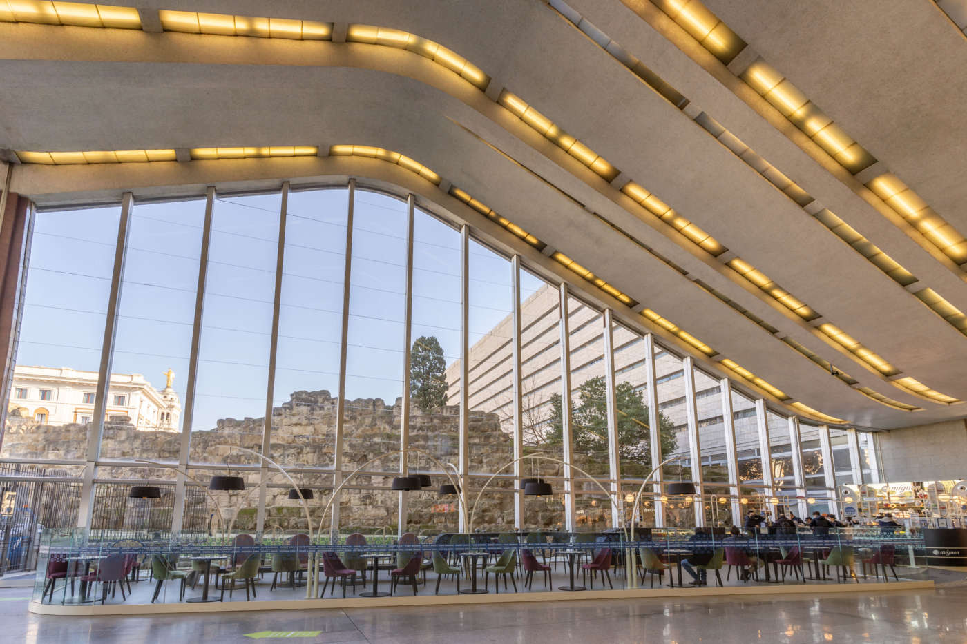 Si tratta di Mignon alle mura, un progetto dello studio Amw Architetti Associati, ispirato alle linee sinuose della copertura della stazione progettate da Eugenio Montuori e Leo Calini (nel 1947) e al profilo delle vestigia archeologiche antistanti che fanno da vera e propria quinta scenica. A delimitare il Mignon non ci sono pareti ma semplicemente da un lato, una barriera in vetro trasparente alta poco più di un metro che separa questo spazio dall’atrio stesso, e dall’altro un bancone dalla forma sinuosa.