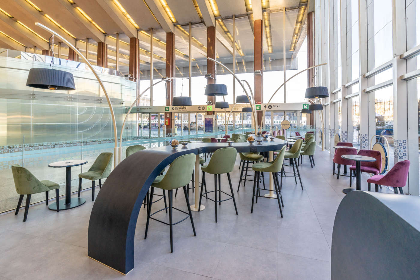 Se da un lato il grande bancone funge da vero catalizzatore per la clientela che entra ed esce dalla stazione, dall’altro lo spazio adiacente dedicato alla consumazione diventa un’oasi elegante e raffinata. Comode sedute in velluto dalle tonalità pastello arredano questa zona del Mignon, dove sedere per gustare meglio le specialità e la bellezza del luogo. A illuminare questo spazio, delle maxi lampade sospese, sorrette da grandi bracci a semi arco che regalano una luce diffusa e morbida in ogni direzione. Elemento di forte caratterizzazione al centro di questa area, un grande tavolo che, con il suo andamento sinuoso, segna e definisce lo spazio declinandosi come elemento distributivo delle sedute in grado di garantire comfort e al contempo privacy agli utenti stessi. «Il richiamo all’epoca decò, - precisano i progettisti- e a quello che le stazioni e le sale di aspetto hanno significato e rappresentato nell’immaginario collettivo, sono il riferimento stilistico che il progetto persegue».