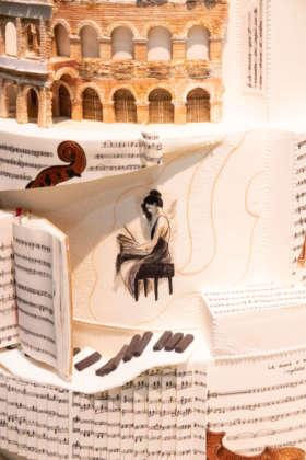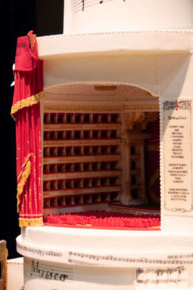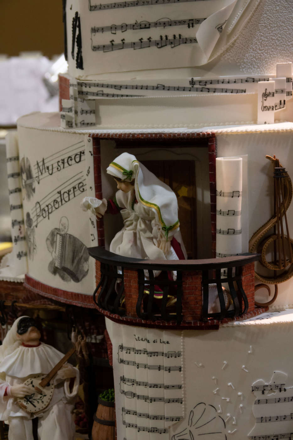 La torta monumentale con i simboli del bel canto italiano è stata realizzata con ingredienti alimentari, edibili. Ogni elemento che la compone è rigorosamente riprodotto con pasta di zucchero, cioccolato plastico, ghiaccia reale, crema al burro e non solo. La costruzione rivela una curatela artistica, capace di andare oltre il concetto di “bello in pasticceria”, attingendo da storia, cultura, costume e società e grandissimo senso estetico.