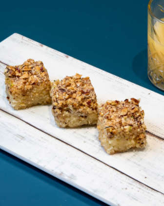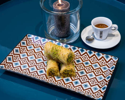 È il dolce più famoso del mondo arabo. Si tratta di un millefeuilles di pasta sottilissima (yufka) tirata al mattarello, farcita di granella di pistacchio siriano, burro di Urfa e sciroppo di zucchero, talvolta aromatizzato (25-30 €/kg). era il dolce più amato dai sultani che lo avevano adottato nei rituali dell’harem e lo dispensavano ai giannizzeri insieme al salario, come forma di ricompensa. Per questo lo troviamo dalle ex province orientali dell’Impero sovietico al Maghreb, in numerose versioni locali. Da Mourad, anche in versioni creative e contemporanee. Il migliore di tutti, il roll baklawa al pistacchio.