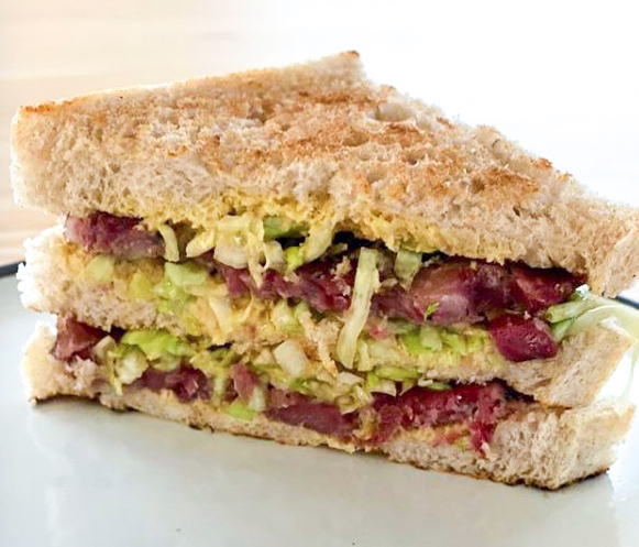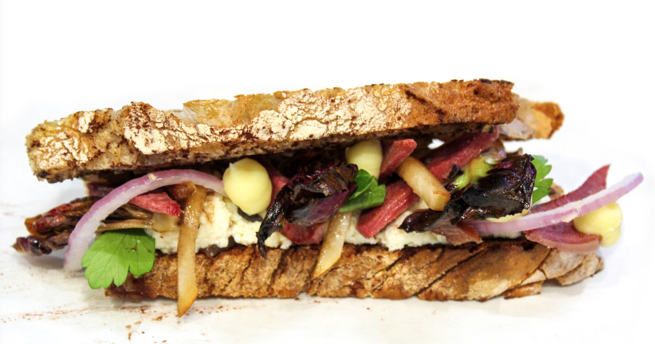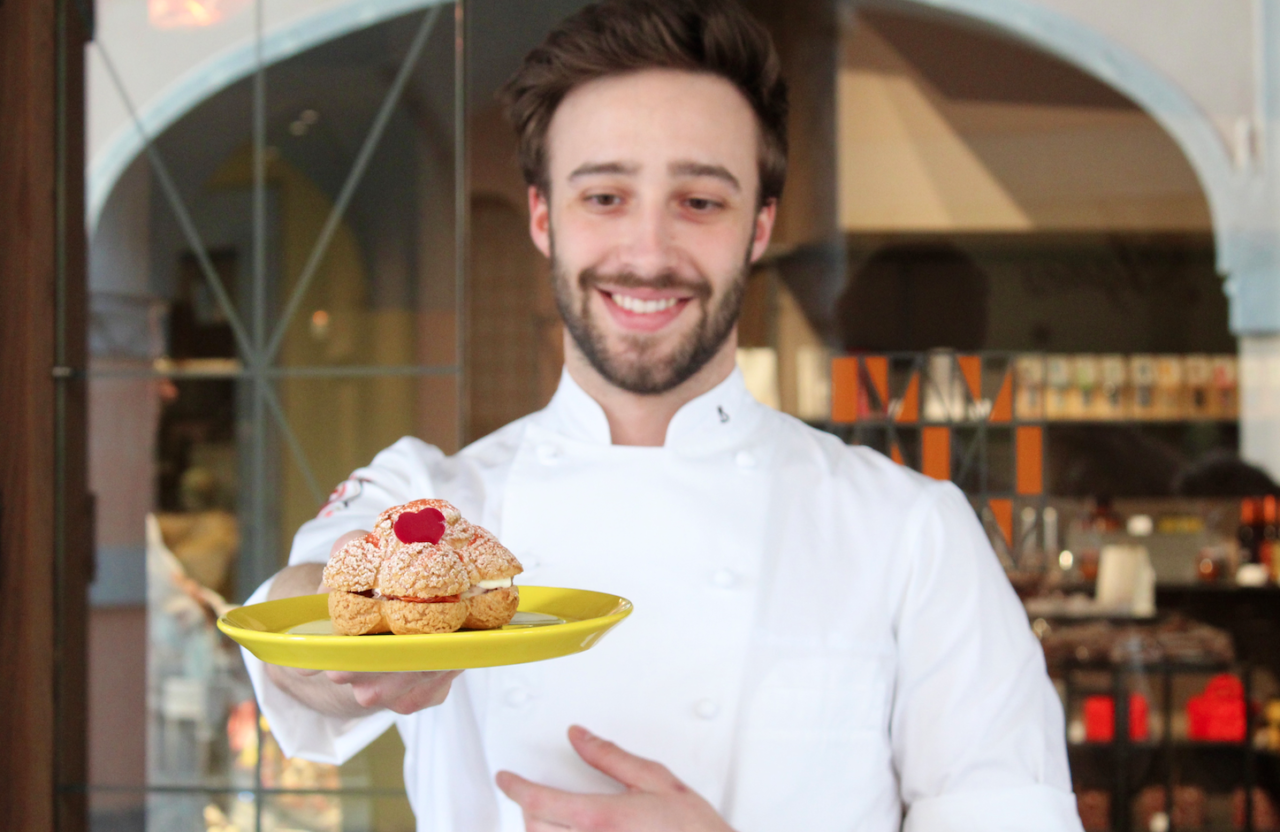 Giacomo Besuschio (foto in apertura) ha pensato a un panino dolce-salato. «L’idea è quella di riprodurre la michetta milanese e per farlo ho realizzato una pasta bignè. Ho farcito il panino con prosciutto cotto piastrato, pomodorini confit, pralinato alla nocciola da noi realizzato con 60% di nocciola trilobata del Piemonte, cremoso di ricotta salata e zest di limone, nocciole tostate per dare croccantezza. Sopra alla pasta bignè un craquelin dolce, terminato con zucchero a velo per ricordare la farina e polvere di pomodoro per dare acidità». Galileo Reposo ha ideato invece un “Panettoast”, un toast che mescola verdura e frutta, somma consistenze e crea un equilibrio inedito, al sapore di Natale. Fra le fette di panettone tostato in padella troviamo pomodoro, finocchio, crema di mascarpone vaniglia e lime, mango, fettine di arancia e lime, barbette di finocchio, polline disidratato e fettine di mela verde. Infine, Nicola Olivieri ha puntato sul salato e sul territorio, con pane in cassetta, bondiola di Sant’Agata (insaccato tipico della zona di Arzignano), cavolo cappuccio con salsa balsamica e senape con crema al rafano.