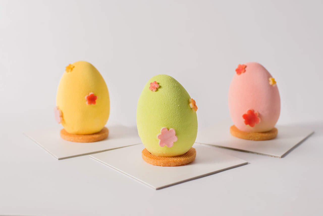 Il laboratorio torinese ha inoltre creato una minicollezione di uova monoporzione dai colori pastello, decorate con piccoli fiori commestibili, che racchiudono una mousse di yogurt e banana, una composta di fragole oppure una mousse di vaniglia e frutti esotici.