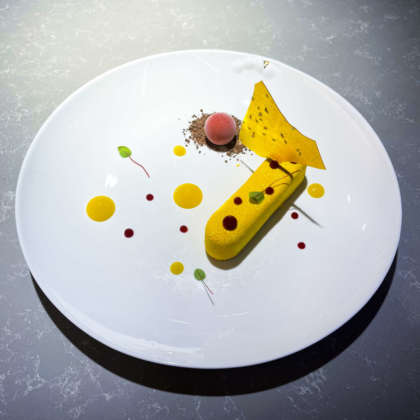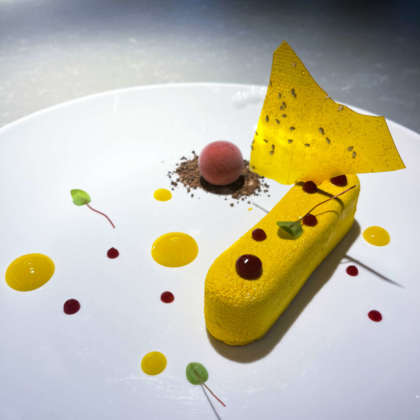 Un lingotto con base di biscotto ricostruito, mousse al limone, biscotto di marzapane e mousse al cioccolato bianco, ricoperto di spray giallo al burro di cacao e guarnito con coulis di lampone e calamansi, sorbetto al lampone e cialda al mango e sesamo. Elaborato ed elegantissimo il dessert ideato dallo chef Alessandro Borghese per la prossima Festa della donna.
