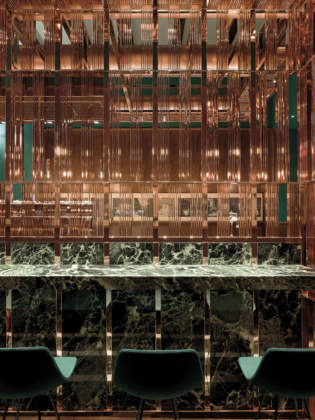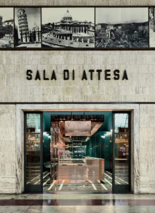 Ad occuparsi del progetto è l’architetto Daniela Colli dell’omonimo studio di progettazione Collidanielarchitetto. In un contesto storico di grande pregio, il nuovo intervento rischiava di risultare stridente, o addirittura invasivo. Era necessario invece partire proprio dai pregiati elementi d’epoca e dalle finiture preziose che rendevano unico questo spazio. Così, la progettista ha pensato a disegnare una struttura che non alterasse l’involucro storico, gli 80 mq esistenti con le sue boiserie e il suo pavimento in marmo, ma che si inserisse come presenza decisamente nuova ma altrettanto preziosa. Ne è scaturito il progetto di un grande elemento nel centro del locale, un volume poliedrico che incarna più funzioni ma che, soprattutto, separa lo spazio in due zone distinte: da una parte la somministrazione di cibi e bevande per chi ha poco tempo prima di prendere un treno al volo e, dall’altro, uno spazio per la consumazione, con un lungo ripiano in marmo e una serie di sgabelli per chi, disponendo di più tempo, può sedersi in tranquillità e in relax.